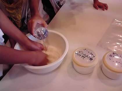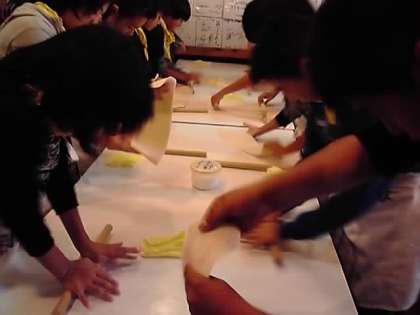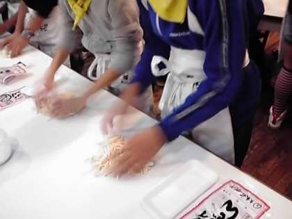 うどん学校に入学し,うどん作りを楽しんでいます。いろいろな肯定を上手にこなしています。
