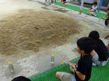 理科の学習の様子です。 閉じこめた水の性質を利用して,噴水を作りました。