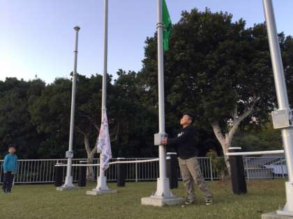 夕食も食べ終わり、旗おろしをしました。次は入浴です。