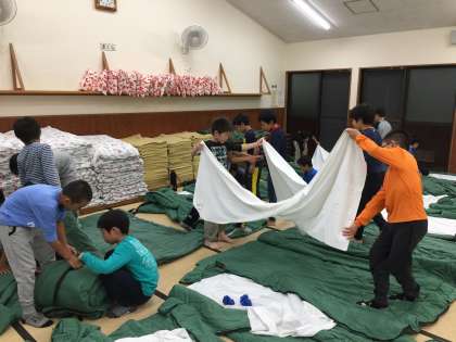 雨のため,テントではなく90畳に寝袋をひいて寝ました。