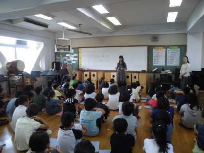 学童音楽会に向けて音楽の学習をしました。良い姿勢で先生の話を聞いています。