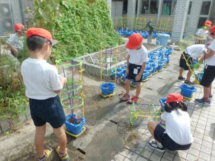 1年生 今週の様子2 あさがおさん,ありがとう 公開日 2017/09/22 更新日 2017/09/22 学校の様子 あさがおの季節ももう終わり。 夏の間,わたしたちの目を楽しませてくれたあさがおさんですが,もうあまり花が咲かなくなってきました。そこで,長くのびたつるをリースにしたいという意見があったので,みんなで挑戦してみました。 つるを切らないように支柱から外したり,根っこを掘って土から抜いたり,大変でしたがみんなで協力してがんばりました。