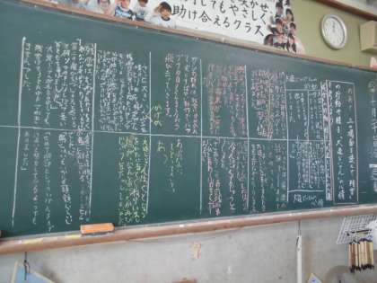 1027 5年生 大造じいさんとガン 公開日 2017/10/27 更新日 2017/10/27 学校の様子 国語科において『大造じいさんとガン』の学習を進めています。今日は3の場面の「残雪」の様子や行動,「大造じいさん」の心情をページごとにグループで書き抜き,まとめたものを全体で共有し合いました。子どもたちの字でいっぱいになった黒板です。発表もグループごとに発表の形式にそって上手く進めていました。