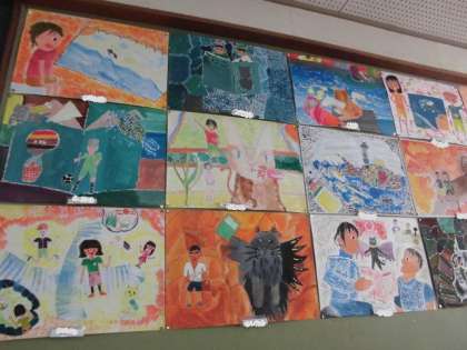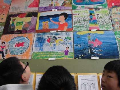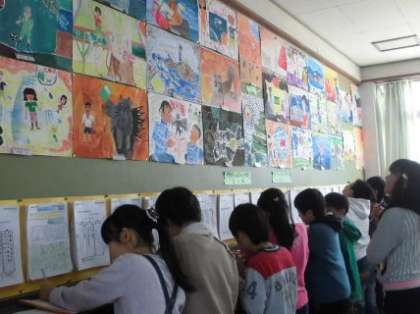 図工科においてお話の絵の観賞をしました。下がきの工夫としては“大小”“遠近”“方向”“重なり”のどれかを選択し,作品に取り入れました。また彩色については,自分だけの色を大切にし,下書きの線をなるべく消さないように塗りました。子どもたち1人ひとりがこだわり,大切に完成させた1枚です。近くに寄りながら,または離れてみたりしながら,友だちの絵を真剣に観賞していました。絵を見て様々な工夫に気付き,発表時にも伝え合うことができました。