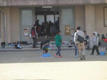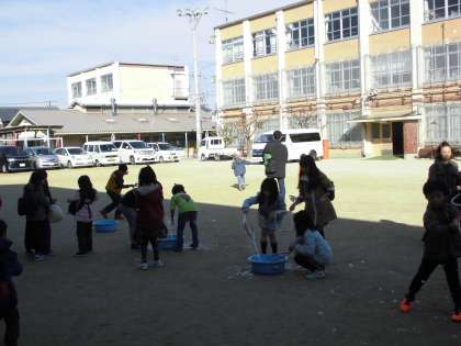 運動場で,ジャンボシャボン玉づくりに熱中している子どもたちです。