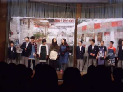 今回の学習のテーマは「全力投球 淀本町商店街に愛をこめて」だそうで,発表はインタビューのまとめをプレゼンテーションしたあと,「大淀新喜劇 淀本町物語」という劇でもりあがりました。