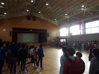 いつものように全校合唱をしました。今月から新曲の「また会う日までさようなら」をはじめて全校で歌いました。なかなかのハイレベルな楽曲で,とくに副次的なメロディのパートの方は音程をとるのが大変難しいのですが,そこは明親の子どもたち,音をとっていました。継続は力なり。日頃の積重ねでしょうね。さすがです。