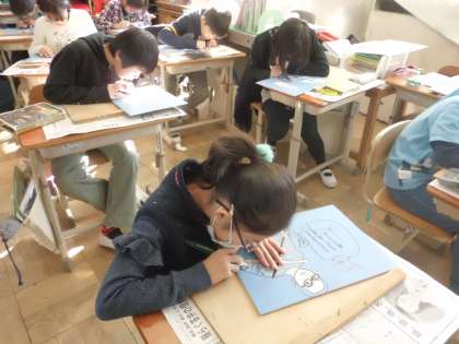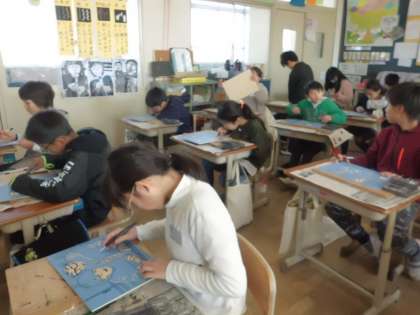 図工科で木版画の学習に取り組んでいます。彫刻刀で彫る工程が終わり,刷る子もちらほらと出てきました。木曜日に完成予定ですので,保護者の皆さまには来週の個人懇談会でご覧いただけたらと思います。