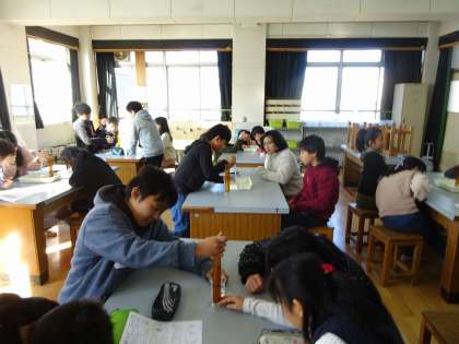 今日は,メスシリンダーで水50mlをはかりとり,食塩がどのくらいとけるのか実験しました。