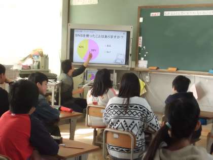 6年生の「情報モラル教室(スマホ学習)」の様子です。インターネットへの投稿の危険性について,考えました。担任の先生と情報モラル市民インストラクターの方とで授業を進めていきました。