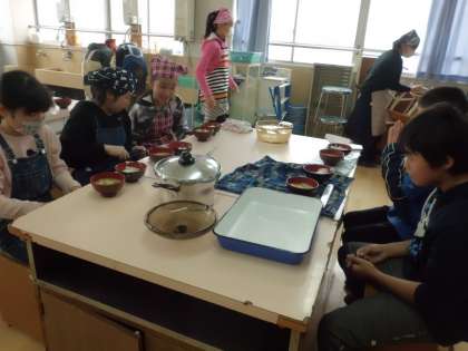 「こんなにおいしくできたのも○○さんのおかげ!」「この油揚げ,上手に切れてるなあ〜」自然と友だちにプラスの声かけができている様子も多く見られました。自分たちで作ったご飯。体も心も温まりますね!