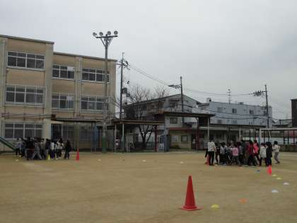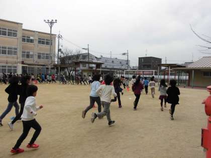 準備の音楽を聞いて,それぞれのスタート位置にスタンバイ。高学年も集中して取り組んでいました。
