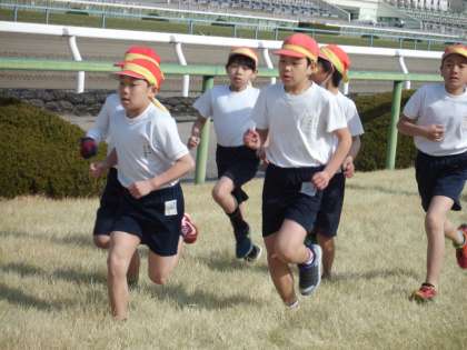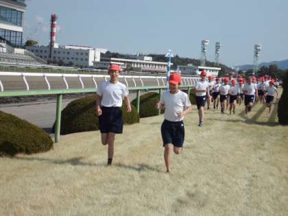 今日は持久走大会がありました。今年はお天気にも恵まれ,明親小学校恒例の京都競馬場で実施しました。