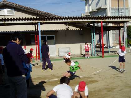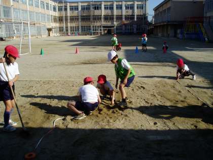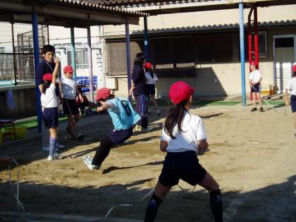 3年生は体育の学習で,走り幅跳びに取り組んでいます。まずは,片足で踏み切り,両足で着地する動きに慣れるところからです。飛んだ距離は,友だち同士で測り合います。
