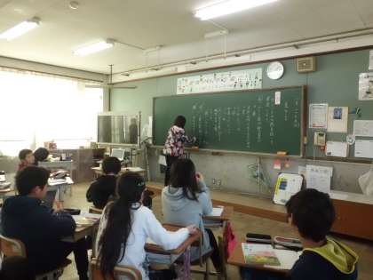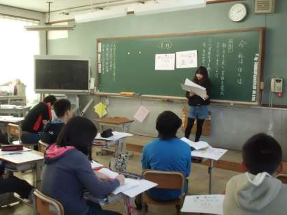 2組は「オリジナルの詩を作って発表しよう」で,漢字一文字をもとにした一行詩を作って発表していました。授業の後半では,谷川俊太郎さんの「生きる」をグループで読みあう展開になりました。