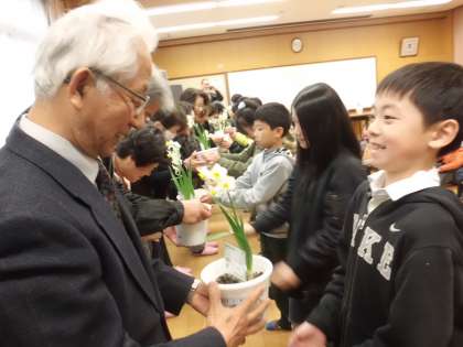 3年生が「人権の花」の球根を育ててきました。白いスイセンの花です。