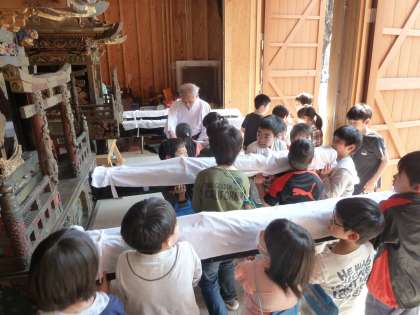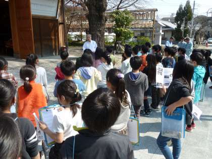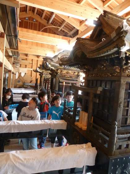 社会科「地域の人びとが受けついできたもの」の学習で,與杼神社のお神輿を見学させていただきました。