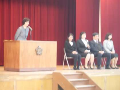 5名の教職員がこの学校を去り,新しい道へ進まれます。校長先生から,一人ずつそれぞれの方の思い出や功績を紹介されました。そして,離任される方一人ずつからお話をいただきました。