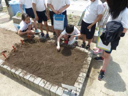 0423 4年生 ツルレイシの種まき 公開日 2018/04/26 更新日 2018/04/26 学校の様子 4年生は理科の学習で,1年を通してツルレイシの観察をします。 今日は学校園に種まきをしました。 暑いとよく育つツルレイシ。 ぐんぐん育ってほしいですね!
