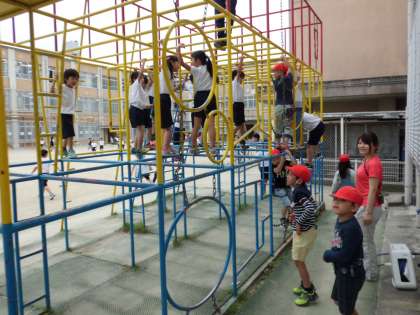 中間休みの様子です。 総合遊具のチャレンジャーでも元気に遊んでいます。