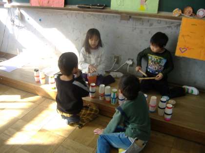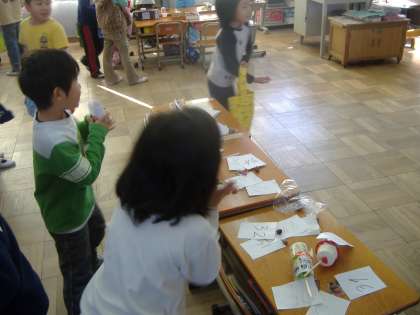 どんぐりや落ち葉などを秋みつけで探してきました。それらを使って,ゲームコーナーやお店を考えてました。時間を前半と後半にわかれて,それぞれ楽しみながら各コーナーやお店をまわりました。ブローチや楽器,アクセサリーなどのお店で選んだり,どんぐりごまをまわしたり,はしでどんぐぐりをつかんだり,落ち葉の中からどんぐりをさがしたり,どんぐりの迷路をしたりなどしました。