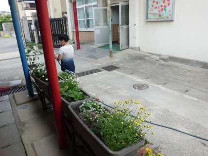 環境委員会の子どもが水やりの当番活動をしています。