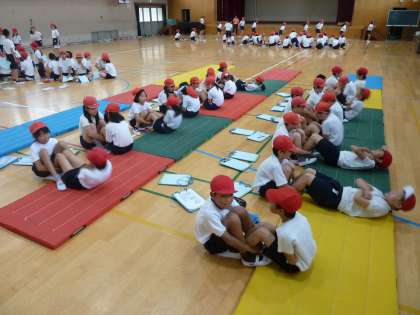 あいにくの天気で,予定していた「ソフトボール投げ」と「立ち幅跳び」はできませんでしたが,体育館で「反復横跳び」「上体起こし」「長座体前屈」「握力」の4種目を行いました。