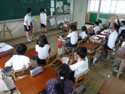 4年2組では,朝学習の時間に不定期で図書係さんが読み聞かせをしてくれています。今日は,みんなも参加できる絵本を選んで,楽しく読み聞かせをしていました。