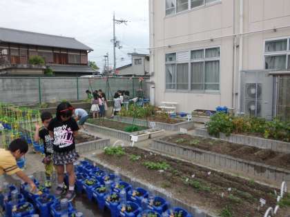 奥のほうで,1年生がナメクジを見つけ,観察していました。