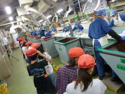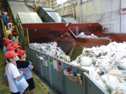 南部資源リサイクルセンターでは,資源ごみの「かん・びん・ペットボトル」をアルミ缶・スチール缶・びん(透明)・びん(茶色)・びん(その他の色)・ペットボトルの6種類に分別する施設です。分別する機械や,パッカー車がごみを運んでくるところを近くで見ることができて,社会の学習を深めることができました。