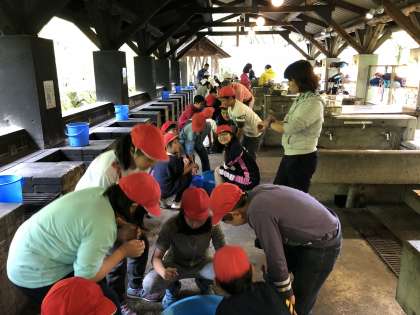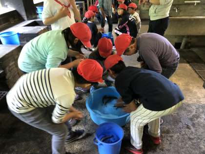 雨天のため,小さな桶で魚つかみを行なっています。