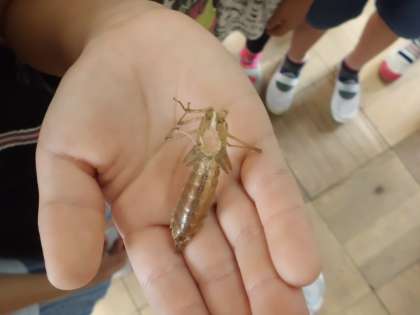 ヤゴの抜け殻があり,廊下にトンボがいました。