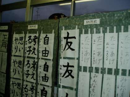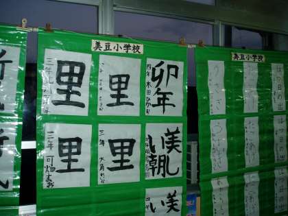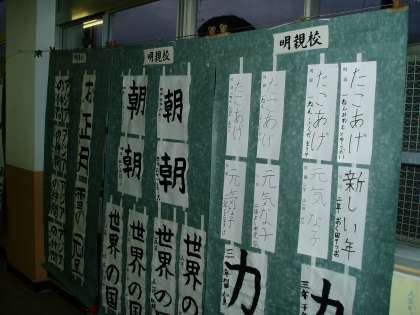 今週は,明親小学校に支部4校の児童の書写作品が巡回で来ています。職員室前に展示しています。