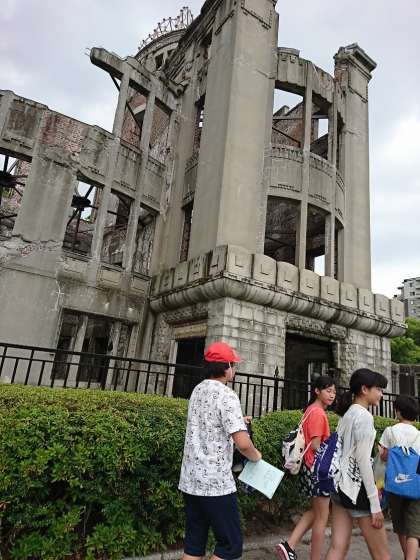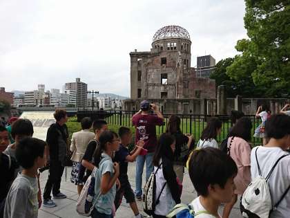 広島原爆ドームを通って,平和記念公園へ向かって歩いています。