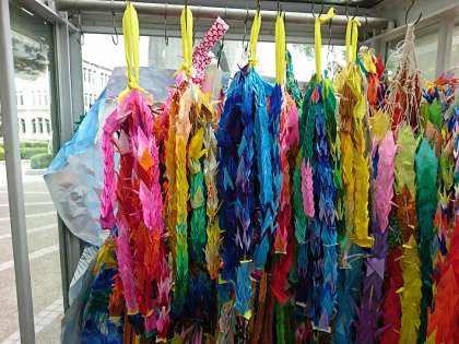黙祷、合唱に続き、学校でコツコツ作りためていた千羽鶴を捧げました。厳粛な雰囲気で取り組みました。