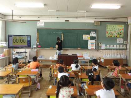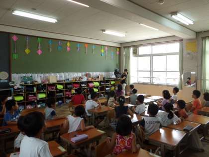 夏休みの自由作品がたくさん並んでいます。 作品紹介をみんなで書きます。
