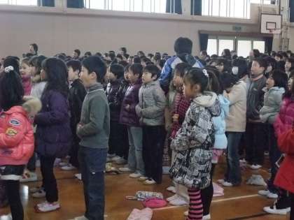 ワークショップ 公開日 2011/02/01 更新日 2011/02/01 学校の様子 2月18日に実施する「舞台芸術体験事業」に備え,今日は2時間目に全校児童で発声の練習をしました。しっかりと口を開け,お腹から声を出すことを教わりました。