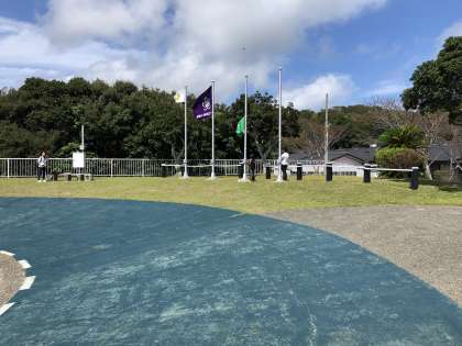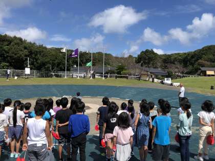 全員で校歌を歌い,明親小学校の旗を掲揚しています。