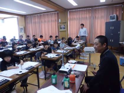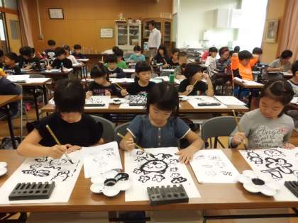 今回のテーマは「毛筆を楽しもう」。指導者は教頭先生です。学校の授業では,3年生以上の学年が習字を学んでいますが,1年生から6年生の児童が,毛筆でいろいろな線を描いたり,絵を描いたりして楽しく学習しました。