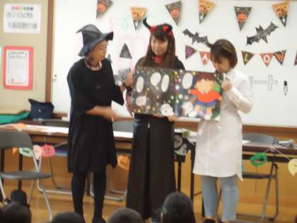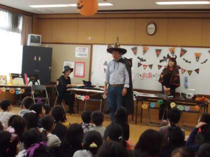 そんな中,校長先生も仮装をして参加。なかなかお似合いですね。子どもたちの中にはおうちから仮装をしてきた人もいます。