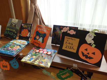 まずは,スタッフによる読み聞かせ。「すみっこのおばけ」みんなこんなおばけが自分のうちにもいたらなぁと思ったことでしょう。ほかにもハロウィンにちなんだ本がたくさん展示されていました。