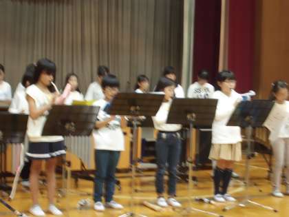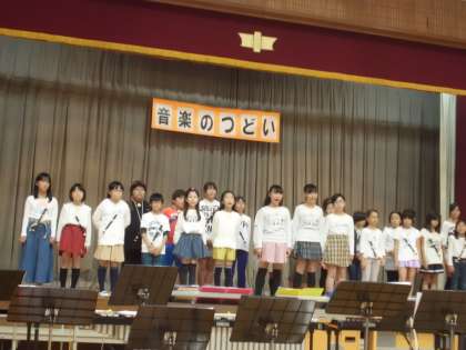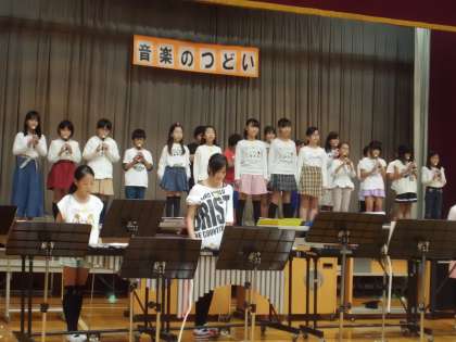 つづいて,音楽部の発表がありました。音楽部は6年生5人,5年生12人,4年生8人の25人で活動しています。「音楽が好き」ということで出会った仲間が,学年を超えてお互いに励まし合いながら練習を重ねてきただけに,どの曲もみんなの心が一つにまとまって観客の心を魅了していました。
