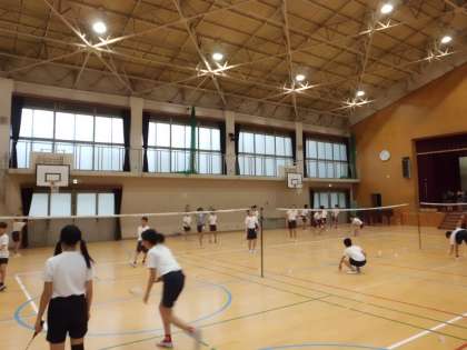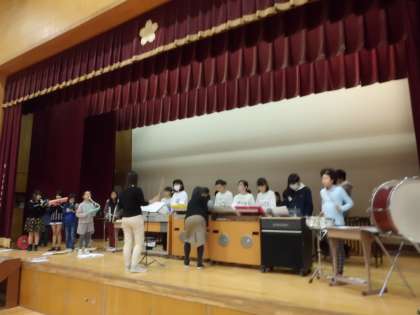 体育館では,バドミントン部が活動をしています。 ステージでは,音楽部が合奏の練習をしています。