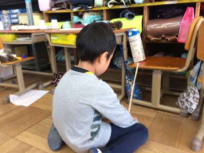 身のまわりにあるものや秋遊びで使った材料の残りを再活用し,