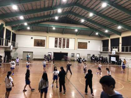12月1日 部活動バドミントン交流会が砂川小会場で始まります。ウォーミングアップの様子です。