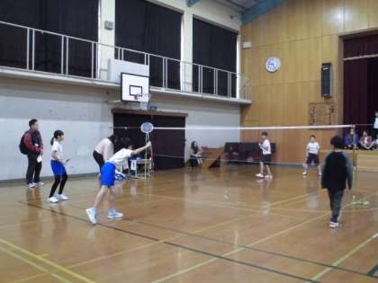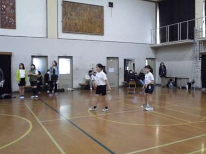 今日は砂川小学校で,砂川・羽束師・深草・明親の4校でバドミントンの交流試合が行われました。明親小からは17名の子どもたちが参加をしました。どの子も全市交流会のころと比べ,グンと成長している様子が見られました。ペアによって,負けたり,勝ったりと結果は様々でしたが,最後まで諦めないという気持ちは,全員から感じることができました。