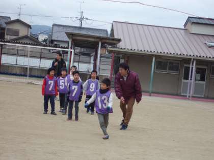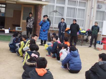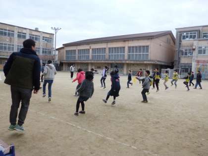 寒いですが,子どもたちは元気です。まずは,準備運動から。そして,大縄をくぐるタイミングをとるための練習です。1年生も頑張っています。