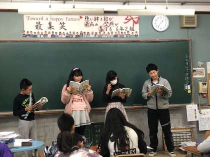 国語科で学習した『柿山伏』の音読発表会をしました。3つの場面を4グループで分け,1つのお話を通しました。8グループあるため2回行いました。音読練習は先週から取り組んできました。小道具もない中で,どう感情を音読にこめるか,それぞれのグループで考え,練習にのぞんできました。