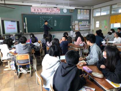 もうすぐMerry Christmas!ということで,ALTのマイケル先生がゲームを考えて来てくださり,ゲームを行いました。6チームに分かれ,チーム対抗戦をしました。アメリカのクリスマス文化に関するQuestionをチームで考え,1つの答えを出し,正解したチームから黒板に書かれた図のコマを動かしていきます。早くにゴールをしたチームから1位というゲームです。マイケル先生の言葉がけ1つで,すごい盛り上がりでした。楽しい時間を過ごせましたね。