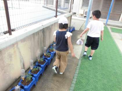 4月25日に,ミニトマトの苗を植えました。「先生!虫がいる!」とびっくりしながらも,友達と協力して植えることができました。「トマト育つかなぁ」「毎日水あげなあかんな」と子どもたちはミニトマトの成長を楽しみにしていました。
